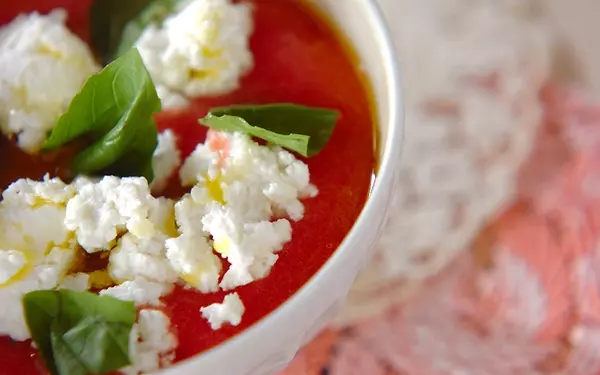 赤・白・緑のクリスマスカラーが印象的なスープです。生のトマトをミキサーにかけ、カッテージチーズとバジルを散らします。トマトは完熟を使うと、甘みがしっかり感じられますよ。暖かい部屋でいただく冷製スープも絶品です。