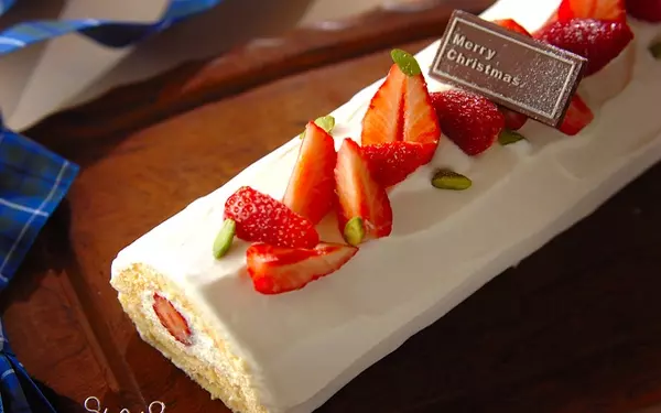 表面をあえてなめらかに仕上げたビッシュ・ド・ノエルは、シンプルさが魅力。ロールケーキの中にイチゴをふんだんに入れるため、どこを食べてもイチゴの甘酸っぱさを味わえます。クリームの白とイチゴの赤、ピスタチオの緑がおしゃれでクリスマスが盛り上がりますよ。