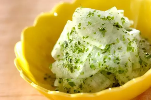 大根を塩もみし、青のりをまぶした箸休めメニューです。ヘルシーなのでおつまみとしても最適です。口さみしい時にどうぞ。