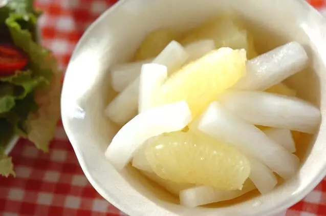 大根とジューシーなグレープフルーツの組み合わせの漬物は甘酢で漬けるだけ! サッパリとした口当たりの良い洋風漬物が完成します。チーズを添えて冷えた白ワインのお供にいかがですか?