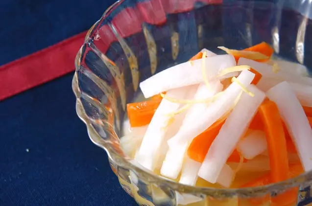 1cm角の棒状に切った大根を甘酢で漬けた箸休めにもってこいの万能レシピです。塩をして余分な水分を出してから漬けるので味がしっかり染み渡ります。甘酢に加えたレモン汁でさっぱり食べやすい美味しさです。