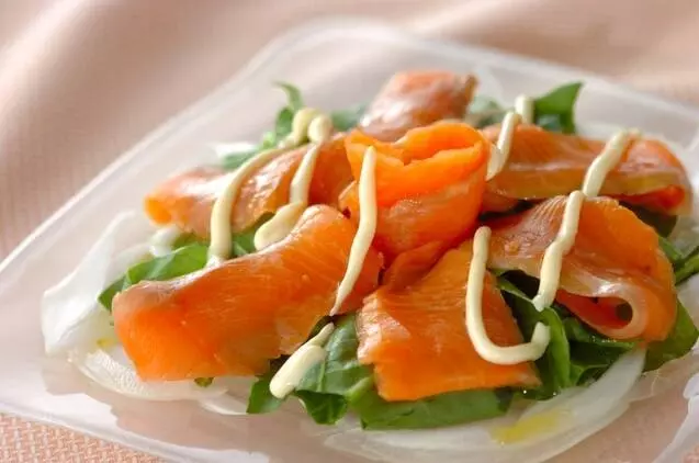 サラダホウレン草のグリーンとスモークサーモンの色彩のコントラストが美しい野菜も一緒に食べるボリュームたっぷりカルパッチョです。マヨネーズ、オリーブオイル、レモン汁のシンプルな味付けで召し上がれ。