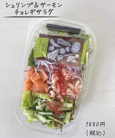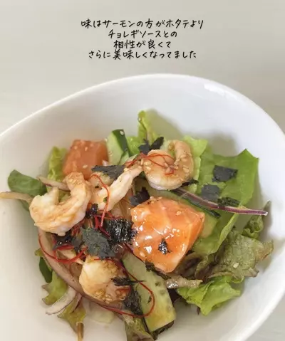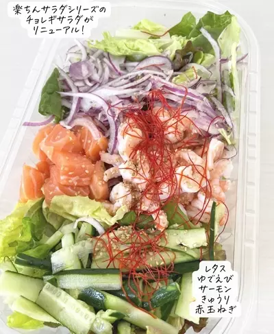 「らくちんサラダシリーズのチョレギサラダがリニューアル。ホタテがサーモンに変更されました!」