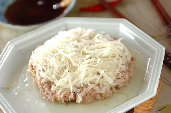 細切りに切ったシュウマイの皮を、肉ダネにつけるだけでできるお花のようなシュウマイです。キャベツやホタテの旨みがきいています!大葉の香りがアクセントに。食欲そそりますよ。