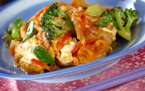 鶏むね肉、ニンジン、豆腐で作るユニークないり鶏です。味付けは砂糖や薄口しょうゆなど筑前煮と同じでOK。煮汁が少なくなったら、溶き卵でとじて仕上げましょう。ブロッコリーとキヌサヤ入りで、栄養も満点です。ごはんにのせても美味しいですよ。