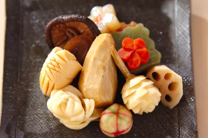 煮しめは具材ごとに煮ると色がキレイに仕上がります。レンコンやクワイは白さが引き立つように薄口しょうゆで、干しシイタケは戻し汁を使って風味豊かにしましょう。それぞれを煮汁ごと保存容器に移し、食べる直前に盛り付けてくださいね。