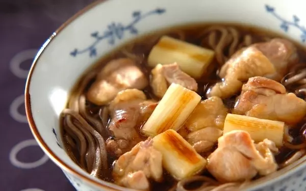 鴨肉の代わりに鶏のだしを効かせるそばです。こんがりと焼いたネギが全体のアクセントに。鶏肉とネギ、そばのハーモニーがたまりません。しょう油、砂糖、みりんは事前に火にかけておくと、そば以外の煮物にも使えて便利です。心身ともにホカホカになりますよ。