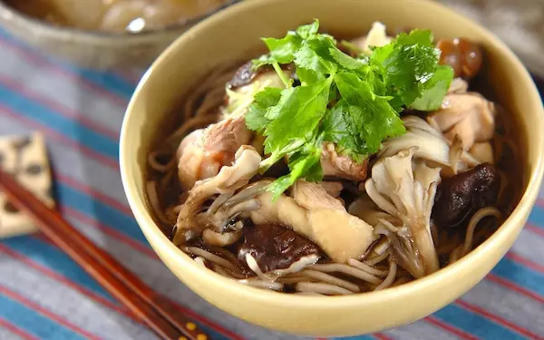 ヘルシーなキノコたっぷりのそばを味わうのも良いですね。シメジ、マイタケ、シイタケの食感と鶏肉の旨みが混じり合い、くせになる味わいです。鶏もも肉は色が変わるまで煮ましょう。もちろん、エノキやエリンギを加えても◎。