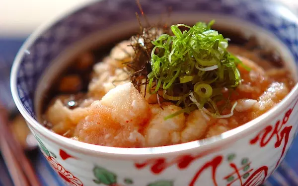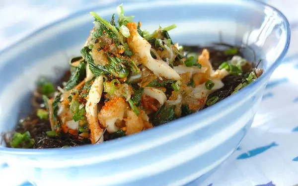 野菜の王様と言われる、栄養満点な「モロヘイヤ」を使うみぞれそばです。夏が旬のモロヘイヤはスーパーでは見かけませんが、通販で冷凍したものを購入できます。ちくわとチリメンジャコの食感が全体のアクセントに。お好みで七味唐辛子を振っていただきましょう。