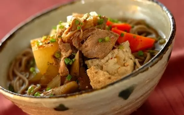 根菜が摂れる豪快なそば。白ネギ、豚肉、ニンジン、ゴボウ、冬瓜、里芋がゴロゴロと入っていて、食べ応えも十分です。食べ進めていくうちに、体の内側がポカポカしてきますよ。お好みで、刻みネギをトッピングしたり、七味唐辛子を振ったりしましょう。旬の根菜たっぷりのそばも良いものですね。