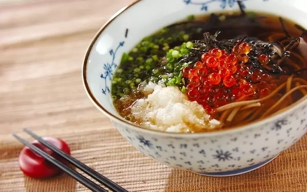 大晦日にイクラがたっぷりのったそばを食べるのもアリです。シンプルな味つけのそばですが、大根、イクラ、刻み青ネギ、刻みのりのトッピングで見た目から華やか。それぞれの食材の風味が効いていて、リピート必至の美味しさです。お正月用のいくらを少しだけ使って作るのもおすすめ。