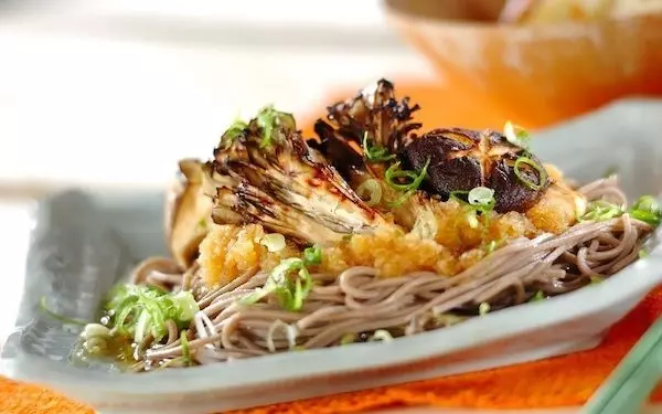 エリンギ、マイタケ、生シイタケをあぶって、そばの具材に。キノコの香ばしさと、そばの風味が見事にマッチし、後を引きます。キノコは、ハケでしょう油をぬり、サラダ油をぬった焼き網で、焼き色がつくまで焼くのがコツです。大根おろしと刻みネギでさっぱりといただけますよ。