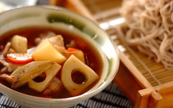 根菜がたっぷり入った温かい汁に、そばをつけて召し上がれ。少しトロミをつけることで、ほど良く温かい状態をキープできます。温かいそばが好きな場合は、冷水で締めず、温かいままでもOKです。