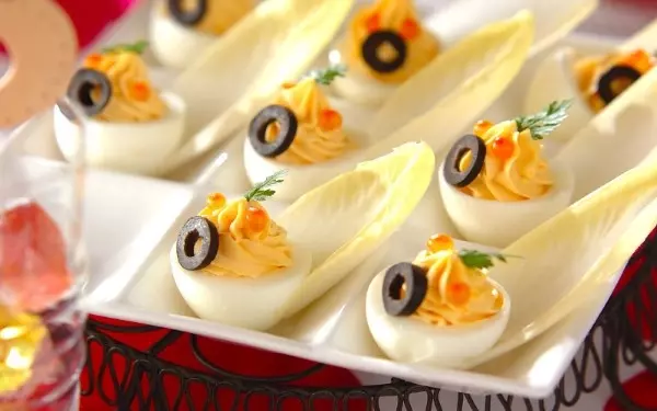 ゆで卵にひと手間加えて、おしゃれなオードブルに。ゆで卵の黄身にカッテージチーズやマヨネーズなどを混ぜ、ホイップクリームのように絞ります。仕上げにイクラとオリーブをトッピングすれば、見た目も豪華です。