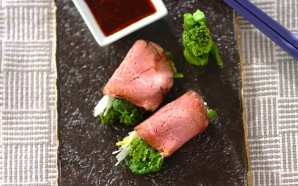 市販のローストビーフに白ネギやショウガなどの香味野菜をクルッと巻く一品です。ピリッとした辛味がローストビーフの旨みとマッチ! 巻き物料理は学業成就という意味が込められているとか。新年にふさわしいですね。