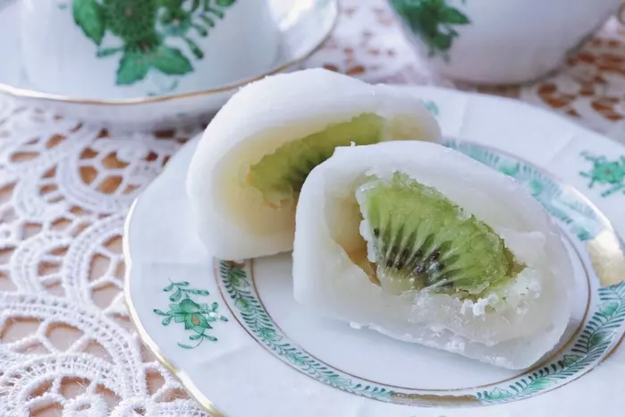 流行りのフルーツ大福をコンビニで手軽に食べられる…!という衝撃、今でも覚えています。キウイの甘酸っぱさと白あんの甘味 ベストマッチでした!SNSでよく見かける、糸を使って大福を半分に切る方法を試してますよ~。キウイの断面が綺麗で映えます~!
