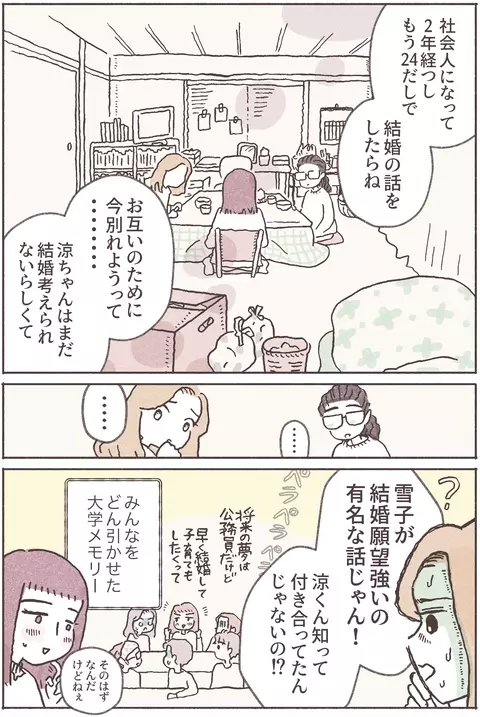 結婚の話をしたら、別れることになった!? 元カレの涼だって、雪子の結婚願望が強いことは知っていたはずなのに…友人たちは唖然状態ですが…。
