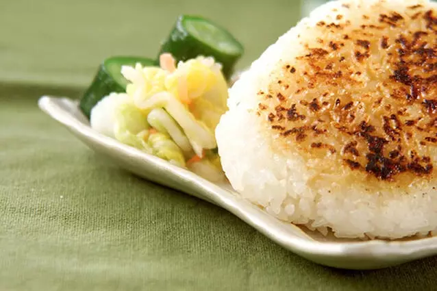 サムジャンをおにぎりに塗ってオーブンへ。旨辛みそがいい感じに焦げてごはんとベストマッチ。トースターなどで焼く場合は、網にサラダ油などのオイルを塗っておけば剥がしやすくなります。