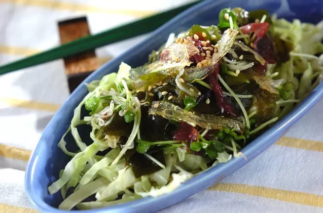 キャベツを入れてボリュームを出した海藻サラダ。しょうゆベースの自家製ドレッシングにはレモンを効かせてよりさっぱりテイストに仕上げます。箸休めに最適な一品です。