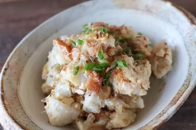 粗く潰した里芋のねっとりホクホクした食感がクセになる和風味のポテトサラダです。梅干しとおかかがいい塩梅。ちらし寿司を引き立てる万能サラダです。