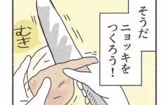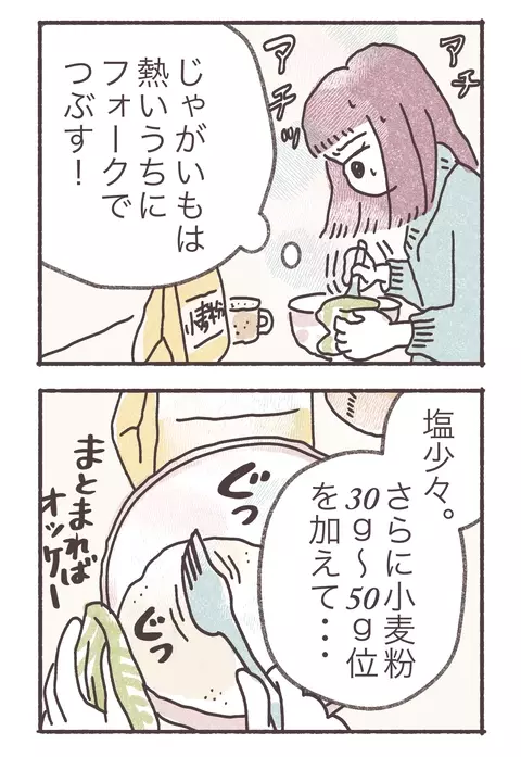 彼氏に結婚の話をしたとたん別れることになってしまった雪子。話を聞いた友人たちは、ジャガイモのポタージュを飲みながら衝撃を受けます。元カレも雪子が結婚したがっていることは知っていると思ったのに。ふたりが帰りひとりになった雪子は思わず涙。ひとりになると元カレのことばかり思い出してしまうのです。ひとしきり泣いた後、もちもちフワフワしたものが食べたくなった雪子は、実家から送られたジャガイモでニョッキを作ることに。