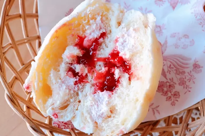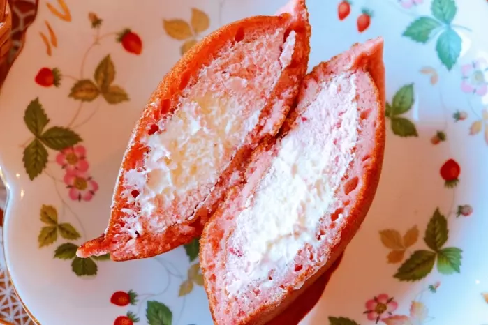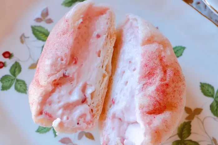 半分に割ると、クリームがむにゅむにゅして、形が崩れそうでした。生地が薄いのも良く分かります。ホワイトチョコクリームを使用したいちごのホイップクリーム、いちごの果肉が少し入っています。これもいちごの味わいが強い!酸味がしっかりで、入っていませんがサワークリーム?のような味わいも感じるほどです。ホイップクリームのシュワシュワ感もあります。ホボクリムという名前の通り、ひたすら中のクリームを楽しむスイーツです!吸い付きたいくらい、やみつきになる味わいです!