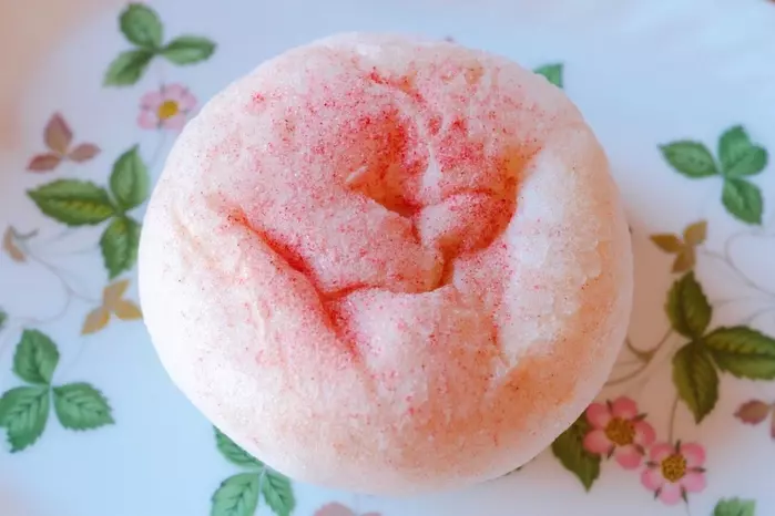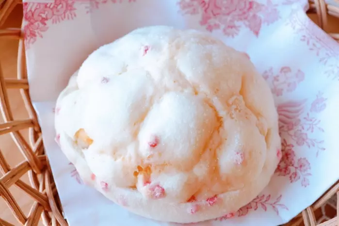 真っ白いメロンパンに、いちごのチョコレートが粒々とコーティングされています。