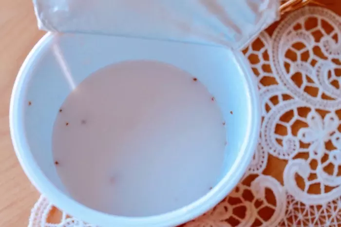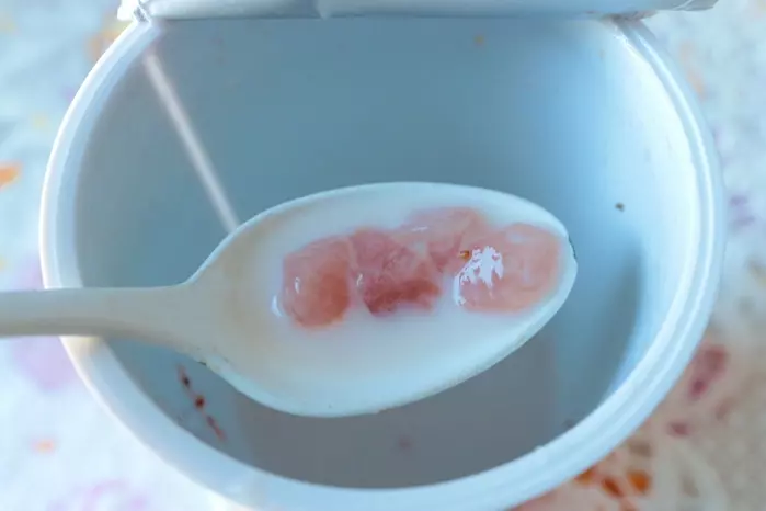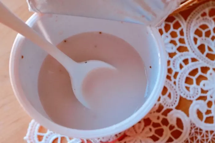 カップの中が気になったので蓋を開けてみました。本家ICHIBIKOの「いちごミルクのもと」のように真っ赤ではないのですが、クリーミーな優しい白さでいちごの香りはしっかりしています。