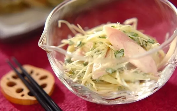 スプラウトと玉ネギを使ったシャキシャキサラダに、魚肉ソーセージの旨みを効かせて。マヨネーズ+牛乳+マスタードのドレッシングはピリッとまろやかで、食欲をかきたてます。