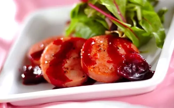 魚肉ソーセージがおしゃれな洋風おかずに大変身! 分厚くカットした魚肉ソーセージをこんがり焼いて、酸味と甘みが効いたベリーソースで召し上がれ。魚肉ソーセージはしっかりと焼き目をつけるとふっくら香ばしく、まるでハムステーキのような食感になります。