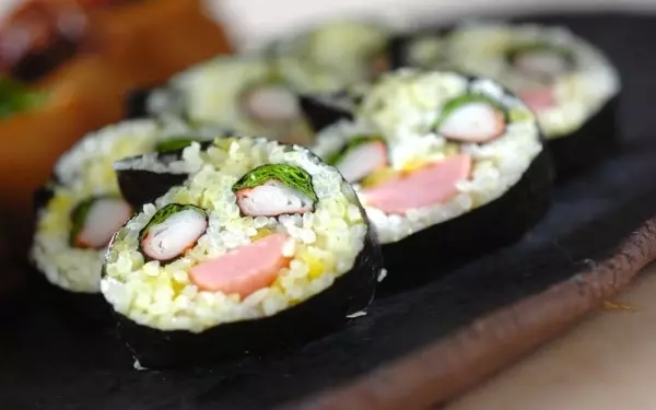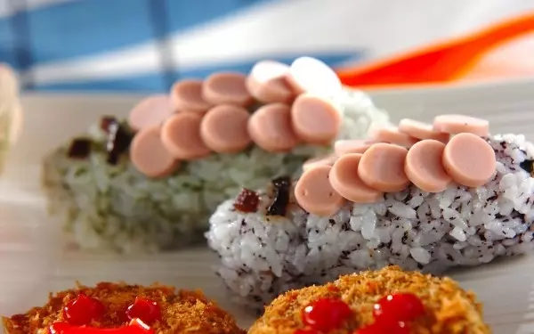 輪切りにした魚肉ソーセージを並べて、魚のウロコに見立てるアイデア寿司です。巻きすがなくてもラップで作れます。混ぜご飯の中にはソーセージも入っていて、ボリューム満点です。中身はエビフライやトンカツなどでアレンジしてもOK。