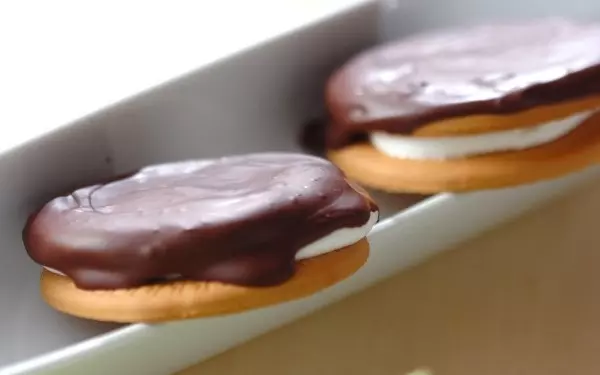 材料はたったの3つ! 市販のビスケットにマシュマロをのせてレンジで加熱し、柔らかくなったらサンドしてチョコレートでコーティングします。サクッと食感のビスケットとモチッと甘いマシュマロのコラボがやみつきに。