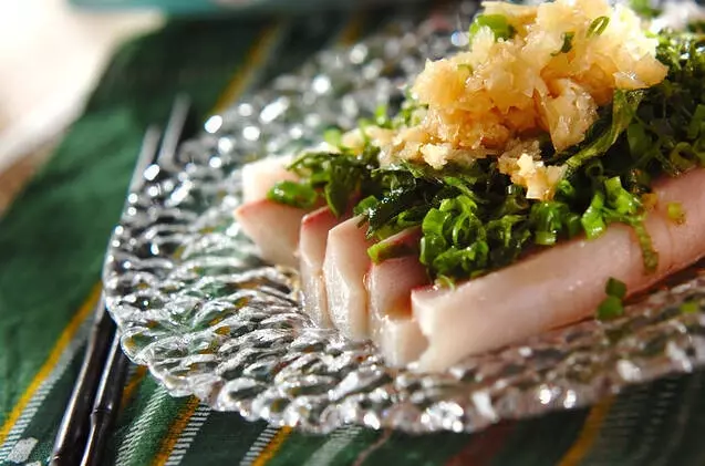 ネギ、大葉、ショウガをたっぷり乗せた食べ応えのあるカルパッチョです。熱したゴマ油をかけると香りよく仕上がります。ブリは削ぎ切りにして、薬味を巻くように食べるとおいしいですよ。