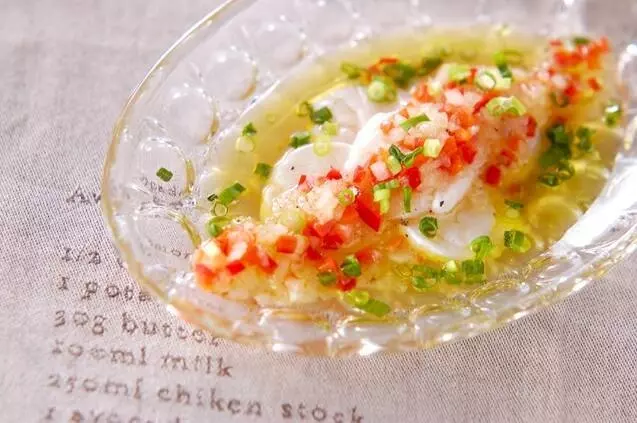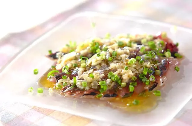 オリーブオイルにしょうゆを合わせた和風ソースにユズコショウを加えてピリリと刺激をプラスします。アジ以外に白身魚も合います。細ネギをたっぷり乗せて食べてください。