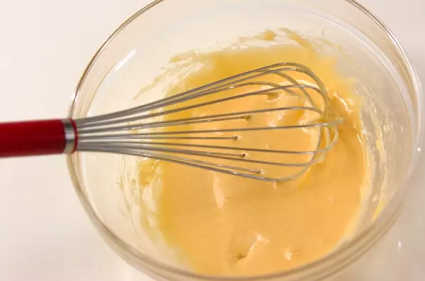 8、卵黄はボウルに入れほぐし、グラニュー糖を加え白っぽくなるまで泡立て器ですり混ぜる。