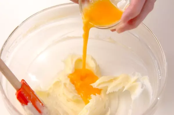 2、粉砂糖を加えてすり混ぜ、卵をよくほぐし、2~3回に分けて入れる。