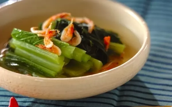 白だしがジュワッとしみた煮びたし。味がなじむまで時間がかかるイメージがあるかもしれませんが、レンジを使えば5分で完成します。干し桜エビの旨みと白だしの風味が上品で、焼き魚や煮物などの献立におすすめです。