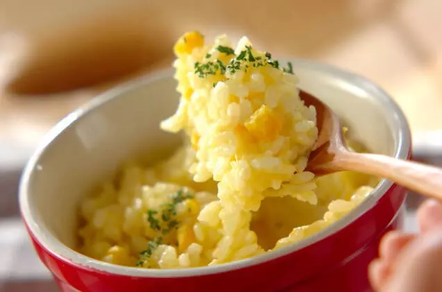 コーンスープの素とご飯、ピザ用チーズなどで作る簡単ごはんです。ポタージュの甘みが広がる、即席リゾット。電子レンジにお任せの超簡単レシピなのでおすすめです。