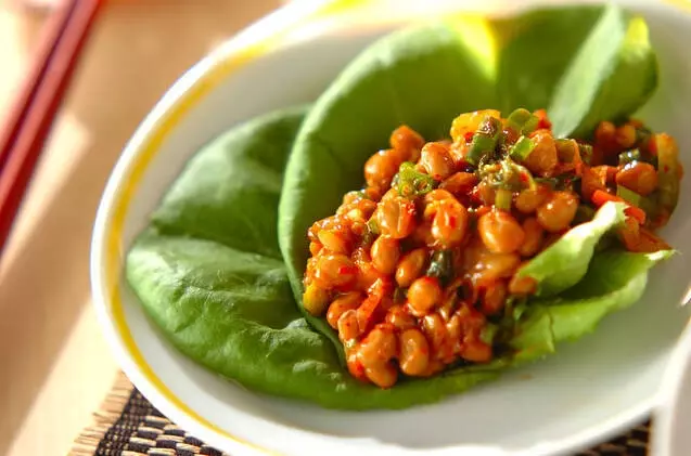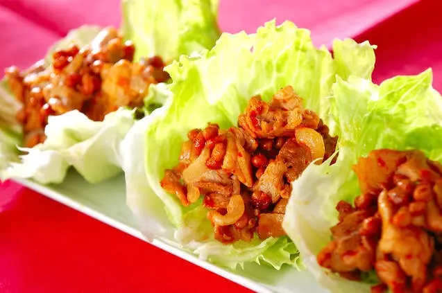 納豆と豚肉を豆板醤でピリ辛に味付けしました。レタス包みにしてシャキシャキ感をプラス。納豆の苦手な方でも食べやすいオススメレシピです。