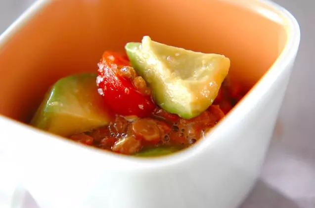 濃厚なアボカドと納豆は相性抜群。トマトの酸味も加わりさっぱりサラダ感覚で食べられます。ビールのお供にオススメです。
