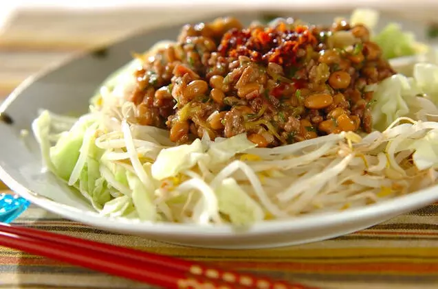 たっぷりのモヤシと納豆を使った、ヘルシーな一皿です。ひき肉が少なくても、納豆でかさ増しできます。そぼろ納豆ソースの上から市販のラー油をかけてもおいしいです!