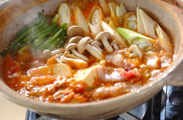 鍋の中でも人気が高いチゲ鍋。みそとコチュジャン、納豆が入りの濃厚な味わいです。コチュジャン効果で身体がポカポカ温まります。
