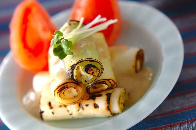 焼くほどに甘みが増すネギとトマトを合わせた新鮮な組み合わせ。下仁田ネギは、網で外側が真っ黒になるまで焼き、外側の皮をむきましょう。ネギ好きにはたまらない一品に仕上がります。