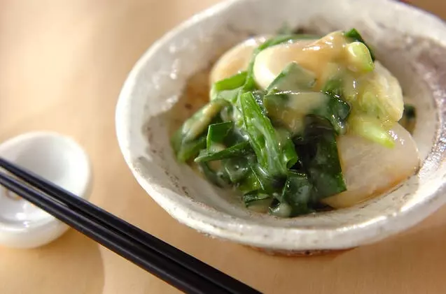 3、食べる直前に<からし酢みそ>でワケギ、アオヤギを和え、器に盛る。