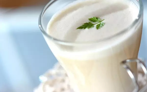 1、ミキサーにセルフィーユ以外の材料を入れてかくはんし、グラスに注いでセルフィーユを飾る。