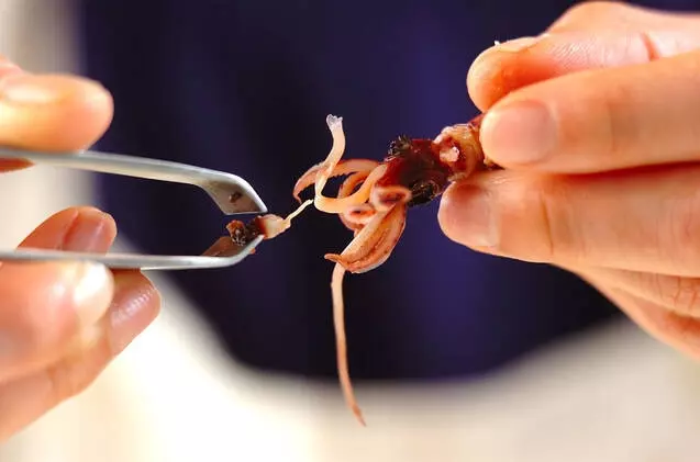 足が早いためボイルされてスーパーに並ぶことが多いホタルイカ。ホタルイカの下処理はかたい目と、くちばしを取ることが大切です。目は指で簡単に取ることができます。また、足の付け根あたりを押すとくちばしが出るので指でつまむように取りましょう。ピンセットを使っても。目とくちばしを取ったらあとはサッと水洗いして調理に使えます。