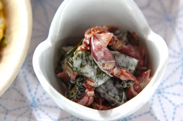 相性が良いホタルイカとワカメを、ユズコショウとマヨネーズで和えました。ピリッとした刺激がありつつマヨネーズのマイルドさがよく合います。少し加えた甘酢がポイントです。