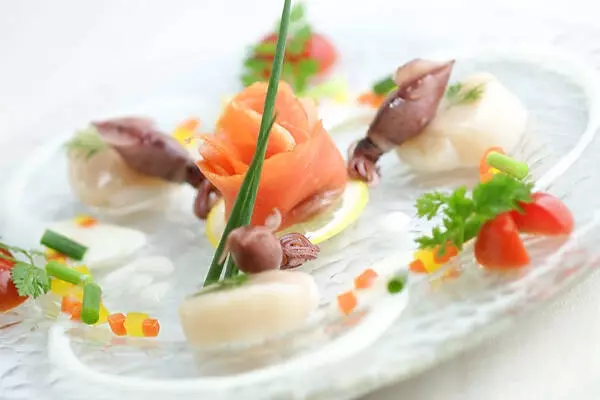 スモークサーモンやパプリカ、プチトマトなどを小さく同じ大きさに切り、器に美しく盛り付けたらホタテとホタルイカを乗せて完成です。写真映えする美しい一皿が完成します。