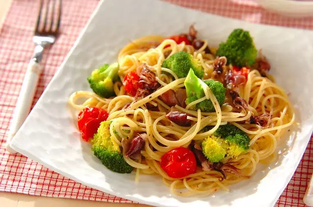 ニンニクを効かせたペペロンチーノ。具材が少ない印象がありますが、ホタルイカとプチトマト、ブロッコリーで作れば彩りが良い美しい一皿が完成します。