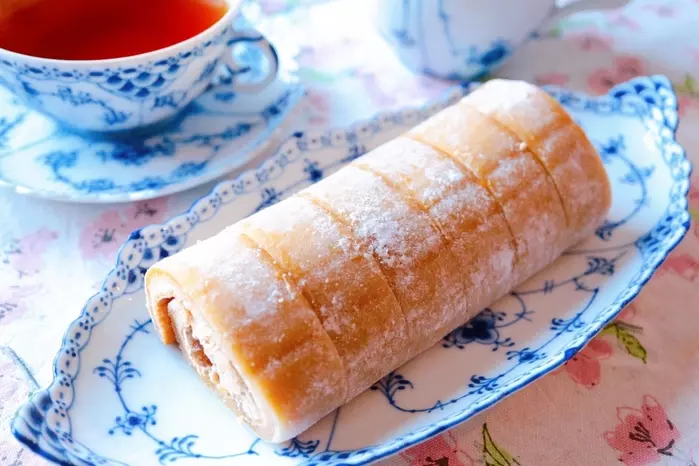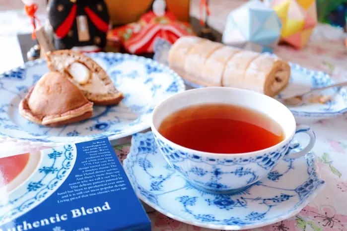 今回「お餅で巻いたもち食感ロール(きなこ&黒蜜)」と「桔梗信玄餅どらもっち」と合わせたのは、デンマークの陶磁器ブランド「ロイヤルコペンハーゲン」の茶器と紅茶です。お雛様の季節なので、和を感じる食器を選びたくなりました。プレートやソーサーのフリル感が繊細で美しいです。紅茶もロイヤルコペンハーゲンのものです。「オーセンティックブレンド」はスリランカディンブラ産の紅茶にジャワ産の紅茶をブレンド。渋みが少ないのでとても飲みやすいです。甘いスイーツと良く合いました。